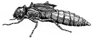 out of the water it waits to dry, its skin splits and the adult emerges.