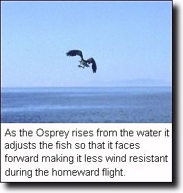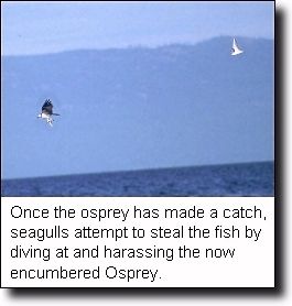 I have been fortunate to witness the actual capture of a fish by anOsprey on a number of occasions. It is truly dramatic! Generally the ospreyhave been circling a particular area at between 50 to 100 feet. Then, whenit appears that they have their prey in a position for capture, the Osprey hasdropped like a stone, smashing into the water in what can only be calledone of nature's most explosive belly-flops! The spray of water completelyobliterates the bird. Then, with light underwings flapping and white breastflashing, the Osprey struggles out of the water, climbing to reach asuitable distance above the surface before it gives a thorough drying shaketo disperse the water. It has been a rare time that I have seen them miss acapture. With fish in its claws, now is the time when other predators andscavengers dive in on the encumbered Osprey. I have watched seagullscommonly attack the Osprey in this vulnerable position. It appears thatonly later, when the Osprey has reached some elevation that the bald eaglewill dive at the Osprey, trying to make it drop the fish which the eaglewill then chase. Last summer I watched a struggling osprey fly towardsshore with a fish that I would estimate at close to two pounds. Just as theosprey began to fly over the shore a pair of bald eagles began theirconcentrated attack in an attempt to make the osprey drop the fish. Firstone eagle and then the other would dive down on the osprey while the ospreyswerved to fend off the much larger raptor, but, to no avail. Eventuallythe osprey dropped his catch with a sharp cry of frustration and theattacking eagle fluttered down to the beach to land by the fish. Theexperience of hunting raptors is one of those true life adventures that Ialways feel most fortunate to observe and share.